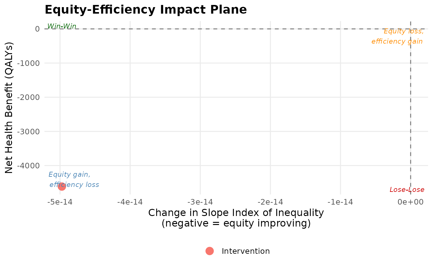 Creates the equity-efficiency impact plane as described in Cookson et al. (2017) Value in Health. The x-axis shows health inequality impact (change in a chosen inequality index), the y-axis shows net health benefit (efficiency). Four quadrants represent: Win-Win (NE), equity gain and efficiency loss (NW), equity loss and efficiency gain (SE), Lose-Lose (SW).