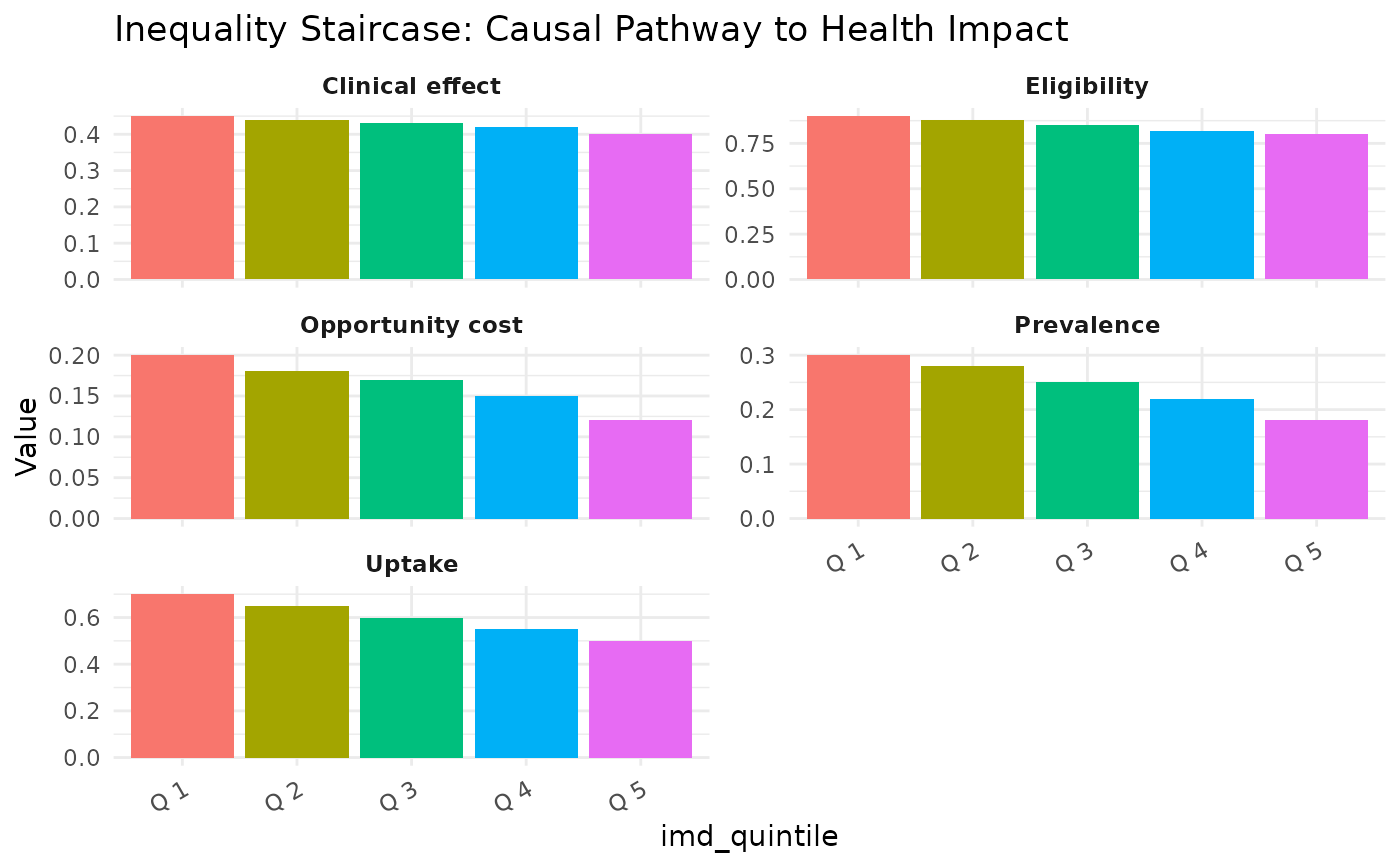 Visualises the causal pathway from intervention access to health inequality impact across the five staircase steps: (1) disease prevalence by group, (2) eligibility, (3) uptake/access, (4) clinical effect, (5) opportunity cost distribution.